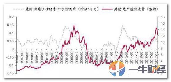 美国新建住房中位价同比数据与美国地产股股价相比,两者走势大体一致,但两者大致要滞后3个月。