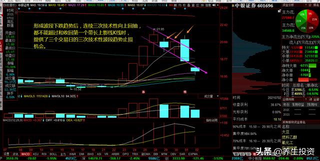 形成波段下跌趋势后,连续三次技术性向上回抽,都不能超过和收回第一个带长上影线K线时,提供了三个交易日的三次技术性波段趋势止损机会。
