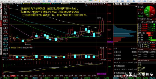 连续多日向下杀跌洗盘,股价到达筹码获利20%左右,收出低位企稳的十字星或小阳线后,这时候的筹码密集区域上方的套牢筹码已经被清洗干净,具备了向上拉升的技术条件。