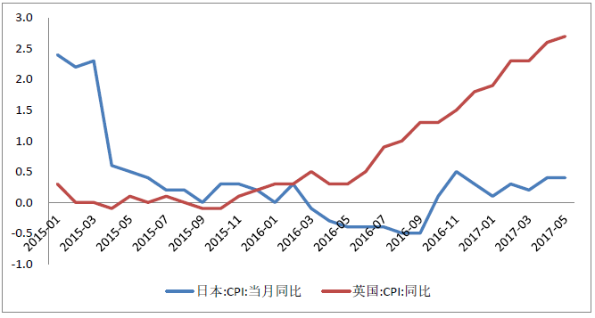 尽管6月份欧央行鹰派不及预期,英国央行在政治压力下维持利率水平不变以及日本央行依然延续相对宽松预期,但是可预见的是本年度下半年,欧英日等国面临紧缩的可能性更大。尤其是英国央行和日本央行面临更强的紧缩紧迫性:英国当前的通胀已经高达2.7%,而退欧谈判和首相大选等政治事件似乎对经济的影响甚微;日本央行的长期宽松政策则是面临着银行利润低、央行无债可买以及坐庄股市等问题,况且两国经济复苏均有不错的态势。而欧央行方面,尽管经济结构分化问题存在,但是在6月会议声明中首次删除了“未来可能进一步降息”,开始了向市场释放不再宽松的信号,未来紧缩政策是大势所趋。