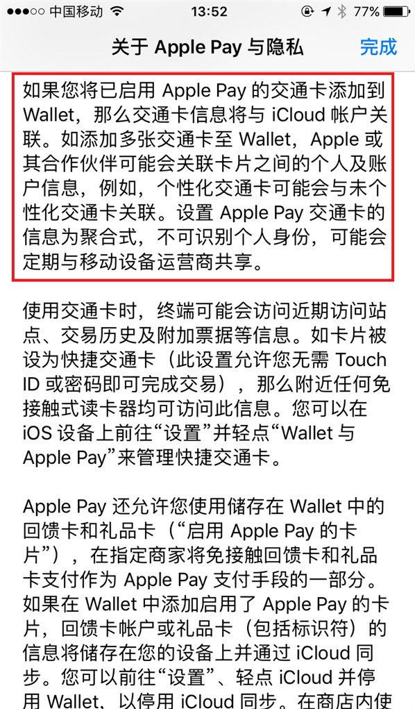 有网友在"关于Apple Pay与隐私"的协议中,发现了关于Apple Pay与交通卡的绑定政策。苹果表示,如果卡片被设置为快捷交通卡,则无需Touch ID或密码解锁即可正常刷卡,也就是说只要经过正确设置,用Apple Pay刷卡和手持公交卡刷卡几乎没有差别。