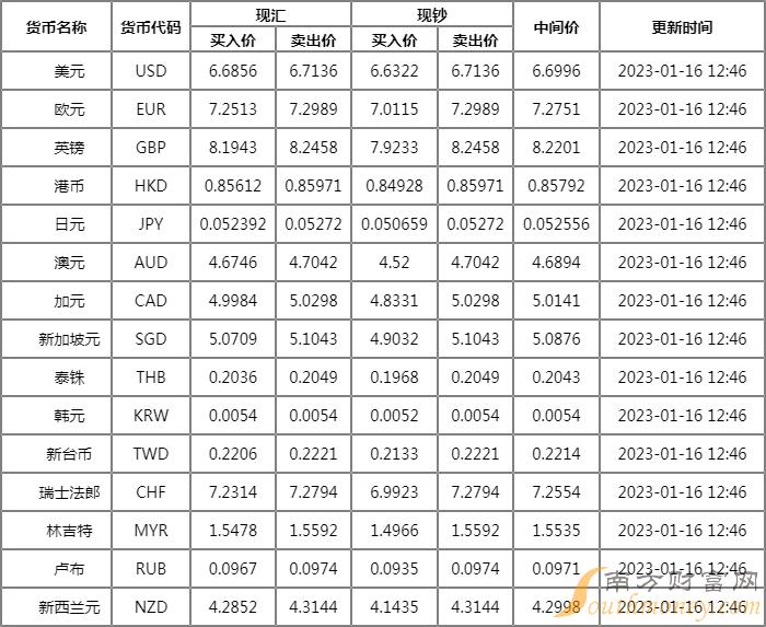 2023年1月16日银行间外汇市场人民币汇率中间价为:1美元对人民币6.7135元,1欧元对人民币7.2709元,100日元对人民币5.2431元,1港元对人民币0.85958元,1英镑对人民币8.2099元,1澳大利亚元对人民币4.6813元,1新西兰元对人民币4.2839元,1新加坡元对人民币5.0883元,1瑞士法郎对人民币7.2438元,1加拿大元对人民币5.0120元,人民币1元对0.64532马来西亚林吉特,人民币1元对10.1872俄罗斯卢布,人民币1元对2.5096南非兰特,人民币1元对184.46韩元,人民币1元对0.54699阿联酋迪拉姆,人民币1元对0.55953沙特里亚尔,人民币1元对54.5407匈牙利福林,人民币1元对0.64560波兰兹罗提,人民币1元对1.0236丹麦克朗,人民币1元对1.5439瑞典克朗,人民币1元对1.4709挪威克朗,人民币1元对2.79836土耳其里拉,人民币1元对2.7962墨西哥比索,人民币1元对4.9023泰铢。
